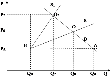 На рис. 1 дана подробная графическая интерпретация случая установления потолка цен. На основе фиксированных цен в условиях рыночной экономики государство, как правило, пытается решить те или иные социальные вопросы. Так, к установлению максимальной цены (потолка цены — РА) государство вынуждено прибегать, когда равновесная цена (Р0) столь высока, что исключает данный товар из потребления большей части населения, а товар относится к предметам первой необходимости (хлеб, сахар, молоко). Чаще всего подобная ситуация вероятна в периоды войн, кризисов, неурожая и т.п.