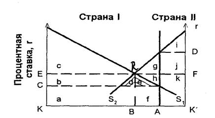 Существуют страна I, имеющая в своем распоряжении капитал в размере АК, и страна II, имеющая в своем распоряжении капитал в размере АК'. В целом капитал, которым располагают обе страны, составляет КК'. Прямые S1 и S2 показывают рост стоимостного объема производства в зависимости от объемов вложения капитала, соответственно, в стране Iи стране П. Если международного движения капитала не существует, то страна I инвестирует весь имеющийся у нее капитал внутри страны и получает доход на капитал (например, процент, дивиденд и пр.) в размере КС, а страна II также инвестирует весь имеющийся у нее капитал у себя в стране и получает от этого доход К'D). Объем производства страны I с помощью этого капитала составит сумму сегментов a+b+c+d+e+f из которого прибыль владельцев капитала составляет а+f, а остальное представляет собой доход владельцев других факторов производства, таких как земля и труд. Объем производства страны II составляет i+j+k, из которого прибыль владельцев капитала составляет j+k, а остальное представляет собой доход владельцев других факторов производства. То, что КС < К'D), означает, что прибыльность вложения капитала в стране I ниже, чем в стране II.