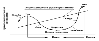 Экономические циклы (волны) - это постоянные, периодически повторяющиеся во времени, взлеты (подъемы) и падения (спады) рыночной конъюнктуры, экономической активности, отличающиеся друг от друга продолжительностью и интенсивностью при наличии долговременной тенденции к экономическому росту. Цикл охватывает период движения экономики от одного подъема (спада) до другого. Один цикл может занимать несколько лет, отличаясь от других продолжительностью и интенсивностью (иногда даже отсутствуют отдельные фазы). В течение цикла происходит увеличение объема производства товаров и услуг, а затем сокращение, спад и, наконец, снова его рост. В верхней точке цикла экономическая активность намного выше тренда долговременного роста, в то время как в нижней точке циклического развития достигается минимальный уровень экономической активности.