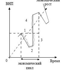 Рис. 5.2 четырехфазная модель: 1 – фаза кризиса; 2 – фаза депрессии; 3 – фаза оживлений; 4 – фаза подъема.