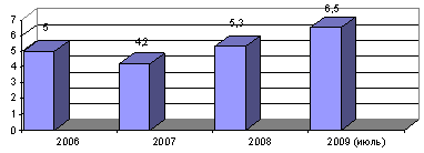 Рис.2.4. Динамика численности безработного населения в РФ в 2006-2009 (июль) гг., млн. чел.