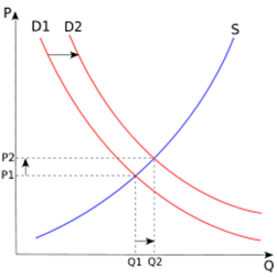 Як вже вказувалося, на попит впливає і ряд нецінових факторів, багато яких отримують ефект за досить довгий час порівняно з часом всановлення рівноваги. Коли число людей, що бажають придбати будь-який товар зростає, кількість товару, який буде проданий за тією ж самою ціною прагнутиме зрости. Збільшення попиту через нецінові фактори може бути представлена графічно як переміщення кривої попиту вправо, що вказує на більший попит для кожної ціни, на зображення від початкової кривої D1 до нової кривої D2. Цей процес піднімить рівноважну ціну з P1 до P2 та рівноважну кількість товару на ринку з Q1 до Q2. У цій ситуації ми говоримо, що мало місце зростання попиту, який викликав розширення постачання.З іншого боку, якщо попит зменшується, трапляється протилежний результат. Якщо початкова крива попиту D2, а потім зменшується до D1, ціна зменшиться, і необхідна кількість товару також зменшиться - викликається скорочення в постачанні. Відмітьте, що це виключно ефект змін у попиті. Кількість, що забезпечується за кожною ціною, така ж сама як і до переміщення попиту. Причина зміни ціни в тому, що рівноважна кількість і ціна змінюється, якщо змінюється попит.