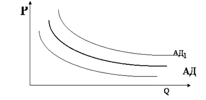 3. Ефект імпортних купівель. Підвищення цін в країні призведе до зростання купівлі імпортних товарів і зменшення експорту за кордон, що вплине на обсяг національного виробництва і рівень сукупного попиту. Під дією цінових факторів сукупний попит змінюється за кривою АД. Таким чином, підвищення рівня цін веде до зменшення сукупного попиту і навпаки. Існують також нецінові фактори, які впливають на сукупний попит. До них належать: 1. Зміни в споживчих витратах: добробут населення; очікування споживача; заборгованість споживача; податки. 2. Зміни в інвестиційних витратах: процентні ставки (за рахунок інших факторів, крім зміни рівня цін); очікувані прогнозні прибутки від інвестицій; податки з підприємств; технологія (нові технології вимагають збільшення інвестицій); надлишкові потужності. 3. Зміни в державних витратах. 4. Зміни у витратах на чистий обсяг експорту: національний доход у закордонних країнах-імпортерах вітчизняної продукції; валютні курси (падіння курсу національної валюти призводить до зростання імпорту і навпаки). Під дією нецінових факторів крива сукупного попиту АД (рис. 1.1) переміщується праворуч вгору, якщо попит збільшується (АД → АД1); ліворуч вниз, якщо попит зменшується (крива АД 2).