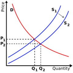 Переміщення пропозиції - також змінює ціну та кількість товару D крива попиту S1 і S2 - стара і нова криві пропозиціїКоли витрати постачальників змінюються через чиннокі вказані вище, переміщається крива пропозиції. Наприклад, при покращенні засобів виробництва, виробники будуть готові забезпечувати більше товару за кожною ціною і це переміщає криву постачання S1 управо, до кривої S2 - зростання пропозиції. Це збільшення пропозиції примушує рівноважну ціну зменшитися з P1 до P2. при цьому рівноважна кількість зростає з Q1 до Q2, оскільки кількість, яка може бути продана, збільшується за новими нижчими цінами. Відмітьте, що це у разі переміщення кривої постачання, рівноважна ціна і кількість рухаються у протилежних напрямкахЗ іншого боку, якщо пропозиція зменшення, наприклад через виснажування родовищ сировини, травляється протилежна ситуація. Якщо крива постачання спочатку біла S2, а потім переміщається до S1, рівноваєна ціна зросте, а кількість зменшиться. Відмітьте, що це виключно ефект заміни пропозиції. Кількість, потрібна за кожною ціною, така ж як і до переміщення постачання. Причина зміни рівноважних кількісті і ціни - зміна пропозиції.Існує тільки 4 можливі напрямки руху на діаграмі кривих попиту/постачання. Крива попиту може рухатися вліво і вправо, також як і крива постачання.