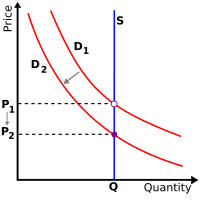При попиті D1 , ціна P1 . При попиті D2 ціна стане P2 . Відмітьте, при обох цінах кількість товару Q залишається постійною через незмінність запропонованого товару. Інколи зустрічаються випадки, що крива пропозиції вертикальна: кількість товару, що постачається постійна незалежно від ціни. Наприклад, кількість землі в світі може розглядатися постійною. В даному випадку байдуже, скільки б хто-небудь був готовий заплатити за шматок землі, додаткова територія не може бути створеною. Також, та ж територія існувала б і без попиту не неї. Якщо земля розглядається таким чином, це гарантує вертикальну криву постачання, надаючи ней нульову еластичність (тобто, байдуже, яка зміна в ціні, кількість не змінюватиметься).Аналогічно зустрічається і вертикальна крива попиту, прикладом якої може розглядатися ціни на деякі екзотичні види сировини протягом короткого часу. У цьому випадку раптова зміна у ефективності добичі не зможе змінити необхідну кількість, через довгий час, потрібний для пристосування підприємств.
