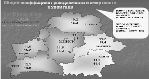 В январе-декабре 2009 года как в целом по республике, так и в областях наблюдался рост общего коэффициента рождаемости. Так, в целом по республике общий коэффициент рождаемости составил 11,6 (в аналогичном периоде 2008 года – 11,1). Самый высокий коэффициент рождаемости отмечен в Брестской области (12,3 на 1000 населения), самый низкий – в Витебской (10,3 на 1000 населения).