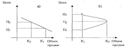 Любая цена, назначенная фирмой, так или иначе скажется на уровне спроса на товар. Зависимость между ценой и сложившимся в результате этого уровнем спроса представлена всем известной кривой спроса.[3] Кривая показывает, какое количество товара будет продано на рынке в течение определенного периода времени по различным ценам. В обычной ситуации спрос и цена находятся в обратно пропорциональной зависимости (чем выше цена, тем ниже спрос). Однако в случаях с престижным товаром кривая спроса может иметь положительный наклон (когда потребители считают высокую цену показателем высокого качества), но при установлении слишком высокой цены объем продаж может снова снизиться (рис. 1.1).