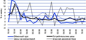 Темпы роста цен производителей, потребительских цен, обменного курсу рубля и широкой денежной базы