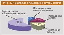 Из общего объема НСР накопленная добыча нефти составляет 16 %, разведанные запасы категорий А+В+С1 – 17 %, предварительно оцененные запасы категории С2 – 8 %, перспективные и прогнозные ресурсы – 58 % (рис. 2).