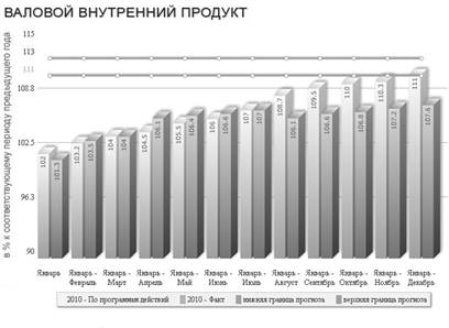 Объем валового внутреннего продукта в январе 2011 г. увеличился по сравнению с январем 2010 г. в сопоставимых ценах на 7,4% (прогнозом на 2011 г. предусмотрен его рост на 9-10%). Доля производственной сферы в формировании ВВП составляет 44,8%, сфера услуг - 42,4%.