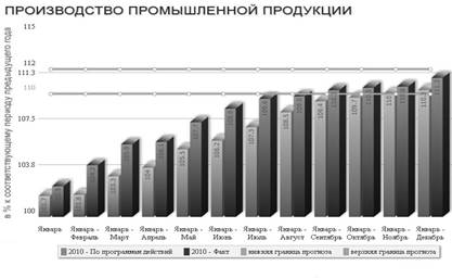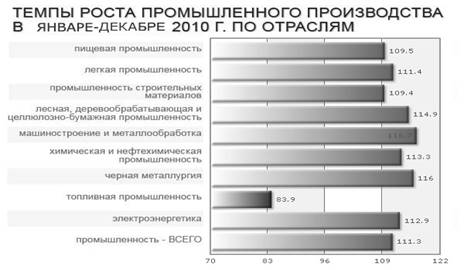 По сравнению с январем 2010 г. индекс промышленного производства составил 106,4% (при годовом прогнозе 109-109,5%), в том числе по видам экономической деятельности «Горнодобывающая промышленность» 103,6%, «Обрабатывающая промышленность» 108% и «Производство и распределение электроэнергии, газа и воды» 96,7%.