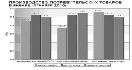 Индекс потребительских цен на товары и услуги в декабре 2010 г. по сравнению с ноябрем 2010 г. составил 101%, с декабрем 2009 г. – 109,9%, в среднемесячном исчислении за период с начала года – 100,8% при прогнозе на 2010 год – 100,6-100,8%. Рост цен на продовольственные товары в декабре 2010 г. по сравнению с декабрем 2009 г. дал 6,4% прироста сводного индекса потребительских цен, на непродовольственные товары – 2,3%, на платные услуги – 1,2%.