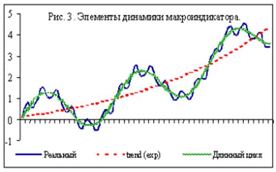 Теория длинных циклов (циклов Кондратьева) является частью теории экономических циклов. В настоящее время науке известно более 1300 видов экономических циклов различного периода. Реальная динамика любого макроиндикатора экономического развития складывается в результате взаимодействия различных циклов (см. рис. 3), однако, длинные циклы преобладают по амплитуде колебаний .