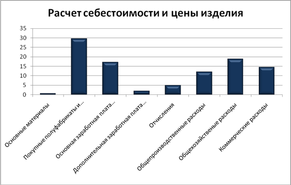 Анализируя диаграмму полной себестоимости изделия, построенную в результате расчетов можно сделать следующий вывод – изделия материалоемкие, так как большую долю затрат (0,68%+29,53%) в структуре себестоимости занимают материальные издержки. Для уменьшения издержек по этим статьям предприятию рекомендовано закупать материалы и комплектующие оптом, провести маркетинговые исследования по поставщикам материалов и заключить договорные обязательства на поставку с теми поставщиками, которые находятся ближе к предприятию.