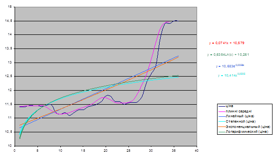 | № періоду | Період | Ціна | плинні середні | лінійна | експоненціальна | степенева | логарифмічна | ||||