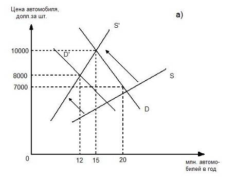 В результате более широкого использования старых автомобилей и расширения спроса на мотоциклы спрос на новые автомобили упадет до 12 млн. в год. Это заставит производителей снизить цену с 10 000 до 8000 долл. (см. рис.1-а).