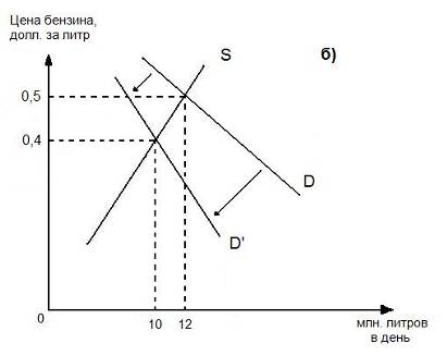 Рассмотрим условный пример с ростом цен на автомобили. Допустим, что цена на автомобиль поднялась с 7000 до 10 000 долл. Это вызовет снижение продаж с 20 млн до 15 млн. автомобилей в год (см. рис.1-а). Падение спроса на автомобили отразится на спросе на бензин. Он сократится с 12 млн. до 10 млн. л в день, это приведет к падению цены бензина с 50 до 40 центов за литр (см. рис.1-б).