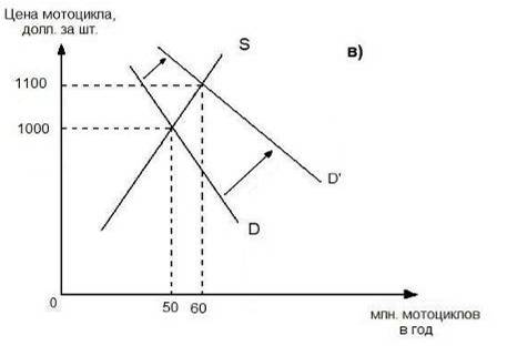Рост цен на автомобили заставит многих отказаться от покупки нового автомобиля и обратить свои взоры на товары-заменители. Не исключено, что высокая цена на автомобиль расширит спрос на мотоциклы и заставит дольше эксплуатировать старые машины. Допустим, спрос на мотоциклы возрастет с 50 млн. до 60 млн. мотоциклов в год (см. рис.1-в). Это поднимет цену мотоцикла в среднем с 1000 до 1100 долл.