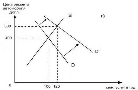 Более длительное использование старых автомобилей приведет к росту цены услуг по ремонту вследствие увеличения спроса на такие услуги. Их число возрастет со 100 млн. до 120 млн. в год, а цена на них в среднем поднимется с 400 до 500 долл. (см. рис.1-г).