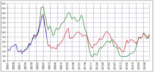 Зеленая линия - прогноз WTI до 2015 г. (от 2006 г.)