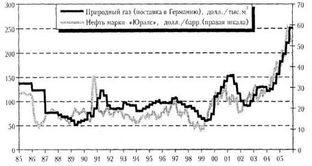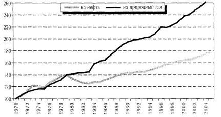 Сказанное свидетельствует об актуальности задачи адекватной оценки потенциала развития российского НГК в условиях крайне изменчивой ценовой конъюнктуры. При этом важно учитывать возможное изменение значимости мировых рынков нефти и газа для российской экономики. Нельзя исключить того, что экспорт нефти лишь временно служит основным фактором экономического роста в России. В условиях ограниченности запасов российской нефти и вероятности возникновения ценовых конфликтов на рынках, замедляющих свой рост, лидирующие позиции вполне могут перейти к российскому газу, по разведанным запасам которого Россия занимает первое место в мире. Конечно, рынок нефти остается ключевым для мировой экономики, обеспечивая, по оценкам, около 85% прироста спроса на первичную энергию до 2030 г. в базовом сценарии развития мировой экономики МЭА. Таким образом, в этот период спрос на нефть будет расти примерно на 1,6% в год. Даже в случае роста цен на нефть на Vs (по сравнению с заложенными в базовый прогноз) спрос на нее снизится лишь на 15%. Тем не менее с учетом того, что мощностей НПЗ недостаточно для удовлетворения растущего спроса на топливо, он может начать постепенно переключаться на природный газ. Фактически это уже происходит: если темпы роста спроса на нефть составляли 1,5% в год в среднем за 2000-2004 гг., то спрос на природный газ увеличивался значительно быстрее - на 2,8% (см. рис.5).
