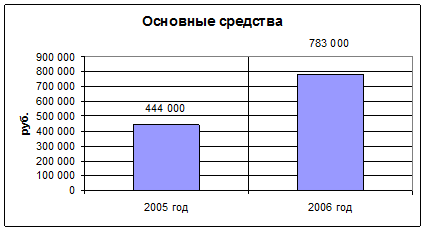 - стоимость всех основных средств на конец 2005 года составила 444 тыс. рублей, на конец 2006 года – 783 тыс. рублей. За анализируемый период стоимость основных фондов увеличилась на 76,35%;