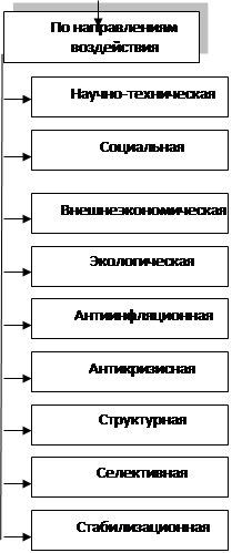 Расширенную трактовку основных видов экономической политики государства приводит С.В.Любимцева в учебном пособии «Макроэкономика». Так, автор классифицирует все многообразие этих видов по трем основным критерия: 1) по направлениям воздействия; 2) по сферам воздействия и 3) по методам и характеру воздействия (рис.2).