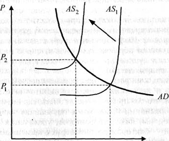 Инфляция, исходя из этих подходов, является результатом макроэкономической нестабильности и определяется как дисбаланс между совокупным спросом (А D ) и совокупным предложением (А S ), вызывающий повышение общего уровня цен.