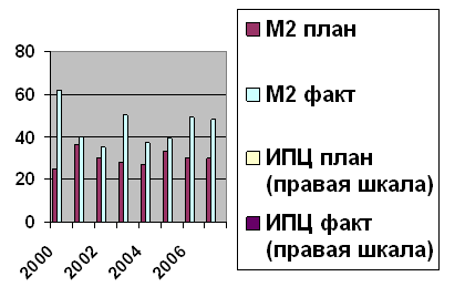 В публично доступных материалах к заседанию кабинета сделана попытка проанализировать причины прошлогодней инфляционной волны. По факторный анализ инфляции привел Министерство Финансов к выводу об однозначном преобладании в ее структуре монетарной составляющей. « Начиная с 2005 года монетарная инфляция не только не сокращается, но и растет. В результате фактический уровень инфляции складывается выше целевых ориентиров. Превышение целей по монетарной инфляции связанно с ежегодным невыполнением ориентиров по приросту денежных показателей», - прокомментировал пресс-релиз Минфина. Действительно, превышение ориентиров по росту денежной массы – систематическое и вопиющее (в 2006 – 2007 годах почти двукратное, см. Прил. Г).