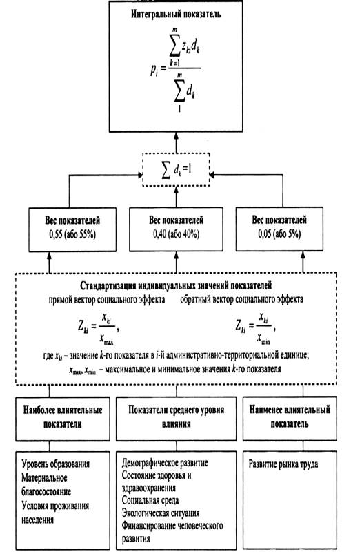 Статистические показатели могут иметь различный вектор социального эффекта: прямой, что свидетельствует о положительных тенденциях в развитии административно-территориальной единицы, и обратный, который, наоборот, отражает ухудшение ситуации. Анализ отдельных показателей не дает полного представления об уровне социально-экономического развития региона, поэтому возникает необходимость в применении комплексного (интегрального) подхода, показанного на рисунке 1.