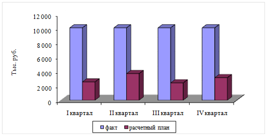 Из данных таблицы видно, что расчетные показатели объема запасов по всем товарным группам и периодам меньше фактических на 35-80%, а в целом на 68,8% или 6963,9 тыс. руб. Иллюстрация сравнения фактических и расчетных объемов запасов по периодам представлена на рис. 3.