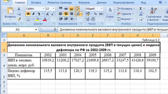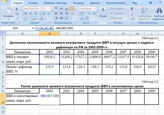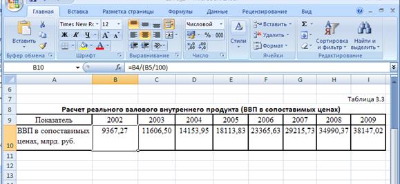 В аналитической части курсовой работы с помощью средств компьютерной техники был рассчитан реальный ВВП на основе данных о номинальном ВВП и индексе-дефляторе по РФ за 2002-2009 гг.