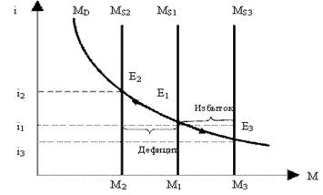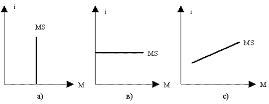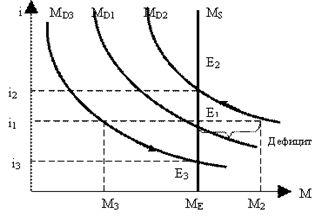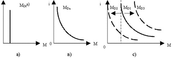 Графически в координатах "ставка процента - количество денег (реальное)" линия спекулятивного спроса (МDa) выглядит как кривая с отрицательным наклоном (рис.1в).