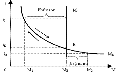 Денежный рынок, так же как и любой другой, представляет собой механизм взаимодействия спроса и предложения. Если спрос равен предложению, то на рынке возникает равновесие. Иными словами, денежный рынок находится в состоянии равновесия, когда спрос на деньги соответствует предлагаемому их количеству и денег в экономике ровно столько, сколько необходимо для обеспечения ее стабильности. Если предложение денег превышает спрос, то начинается рост цен. Население пытается избавиться от денег, ускоряется оборачиваемость денег и цены растут быстрее. Если предложение денег ниже спроса на них, в экономике возникает их дефицит, что негативно влияет на систему расчетов и приводит к бартерному обмену.