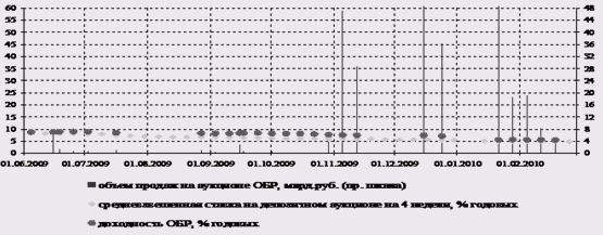 В феврале было проведено 3 аукциона по продаже ОБР, объем привлеченных средств на которых составил 32,3 млрд. рублей. Объем операций Банка России по продаже и покупке ОБР на вторичном рынке в феврале составил 1,82 млрд. руб. и 0,04 млрд. рублей соответственно. Стерилизационные операции Банка России на денежном рынке изображены на рис.7.