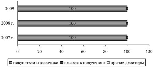 - общая сумма дебиторской задолженности увеличилась на 69 тыс. руб. в 2009 г. по сравнению с 2007 г. и увеличение в 2009 г. по сравнению с 2008 г. составило 35 тыс. руб. Краткосрочная дебиторская задолженность состоит в основном из задолженности покупателей и заказчиков, причем такое соотношение сохраняется на протяжении всего исследуемого периода.