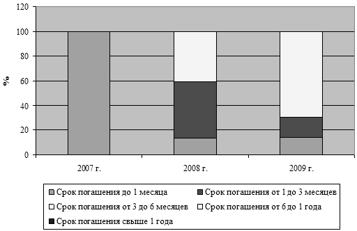 - в 2009 году в структуре дебиторской задолженности присутствовала только нормальная дебиторская задолженность сроком погашения до 1 месяца, в 2008 году основной удельный вес в структуре занимает задолженность сроком погашения от 1 до 3 месяцев, а в 2009 году от 6 месяцев до 1 года. Данные изменения носят отрицательную оценку, так как чем больше срок образования и погашения дебиторской задолженности, тем меньше маневренности приобретают оборотные средства, что негативно сказывается на финансовом состоянии предприятия.