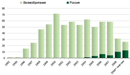 Рисунок 3. Количество подписываемых ГЧП проектов в Великобритании и России.