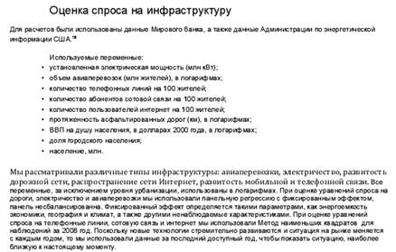 расти спрос на воздушные перевозки и телекоммуникации. Спрос на электроэнергию и дорожное строительство будет расти медленнее, если рассматривать чисто количественные показатели. В этих секторах в силу высокой стоимости строительства и острой потребности в реконструкции большей части старых объектов потребуются наиболее значительные финансовые вложения.