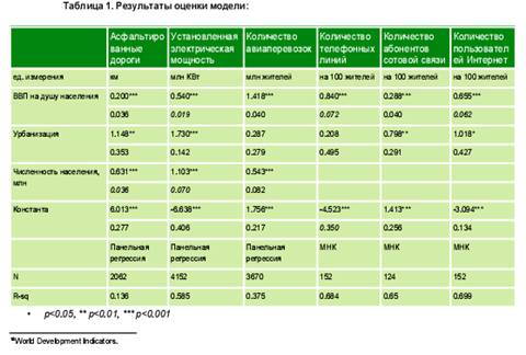 1. Оценить соответствие объема российской инфраструктуры спросу, характерному для страны с таким уровнем развития. Оказалось, что уровень обеспеченности инфраструктурой в России соответствует, или даже несколько выше ее уровня развития. Этот вывод не кажется столь уж неожиданным, если понимать, что по уровню развития (т.е. ВВП на душу населения) Россия находится на уровне таких стран как Латвия, Литва, Чили, Габон. В развитых странах обеспеченность инфраструктурой гораздо
