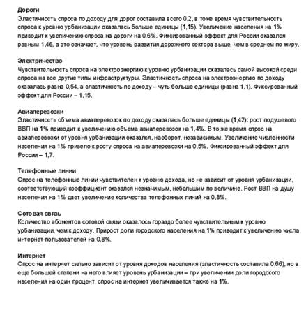 При определении инвестиционного спроса на различные виды российской инфраструктуры стоит учитывать высокую капиталоемкость электроэнергетической и транспортной инфраструктуры, а также ее низкое качество, для улучшения которого неизбежно потребуются значительные денежные вливания. Так, спрос на автомобильные дороги растет самыми медленными темпами, но потребность в инвестициях увеличивается с обострением потребности в реконструкции старых изношенных дорожных участков.