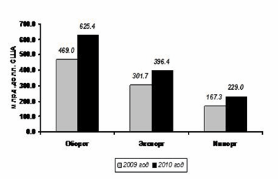 По данным таможенной статистики в 2010 году внешнеторговый оборот России составил 625,4 млрд.долларов США (с учетом данных о торговле с Республикой Беларусь и Республикой Казахстан) и по сравнению с 2009 годом возрос на 33,3%, в том числе, со странами дальнего зарубежья – 534,1 млрд.долларов США (рост на 33,4%), со странами СНГ – 91,3 млрд.долларов США (рост на 33,0%). Данные приведены в Приложении 1.