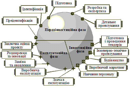 Дані кроки можна об’єднати у три агреговані фази: передінвестиційна (розробка проекту як документа), інвестиційна (формування активів проекту “під ключ”) і експлуатаційна (запуск тагосподарська експлуатація активів і регулярне отримання поточного прибутку, повернення вкладених коштів) ( рис.1.1.1).