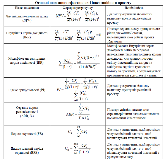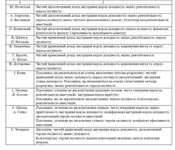 Очевидно, що всі науковці по-різному підійшли до набору критеріїв економічної ефективності інвестицій. Але все одно кожен із них обов’язково виділяє такі показники, як чистий дисконтований дохід, внутрішня норма доходності, індекс доходності таперіод окупності інвестицій. Усі ці критерії базуються на дисконтуванні грошових потоків і євизнаними у світовій практиці основними показниками, що акумулюють вигоди від впровадженняінвестиційного проекту. Саме їхній розрахунок, в першу чергу, вказує на економічну ефективністьінвестиційного проекту.