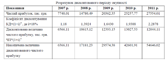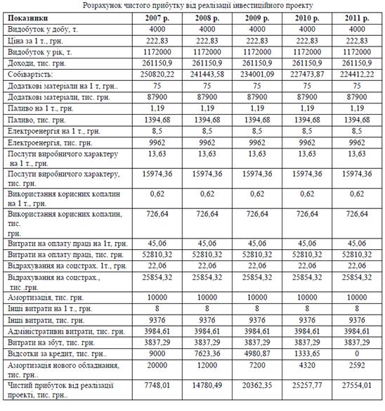 Зробовши необхідні розрахунки, а саме обчисливши чистий дисконтова ний дохід, дисконтований період окупності, чистий прибуток від реалізації проекту, визначивши рівень рентабельності та індекс доходності, встановили, що,запропонований проект є ефективним. Його впровадження дозволить запобігти банкрутству шахти «Білоріченська» та забезпечить стабілізацію фінансового стану підприємства.