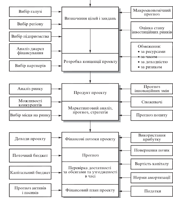 -передінвестиційний аналіз проекту (вивчення потенційних можливостей проекту, оцінка реальності фінансових планів, зовнішньої та внутрішньої узгодженості проекту, його комерційноїреалістичності й доцільності);