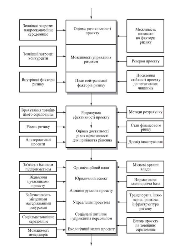 Перелічені аспекти повинні бути розроблені у процесі підготовки інвестиційного проекту, розглянуті під час його аналізу, ураховані при прийнятті рішення щодо інвестування, а також досліджені при реалізації проекту аж до його завершення чи припинення.