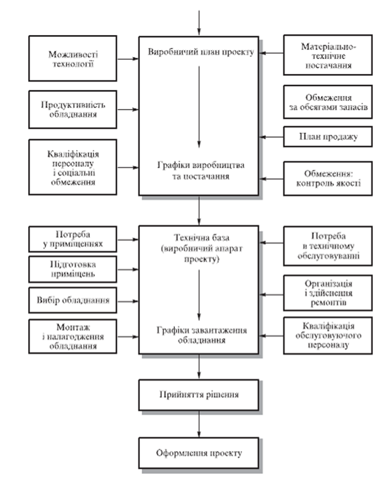 Етап прогнозування об`ємів виробництва і прибутку. На цьому етапі розробник проекту виходячи з можливого об`єму реалізації визначає розмір і технологічний рівень підприємства. При цьому слід мати на увазі масштаб доступних джерел фінансування. Потім аналізуються ціни і умови оплати устаткування; порівнюються альтернативні варіанти (викуп устаткування або лізинг); аналізується ринок оренди (покупки) необхідних приміщень; кількість, кваліфікаціяіоплатаперсоналу,щопривертається,ітакдалі.