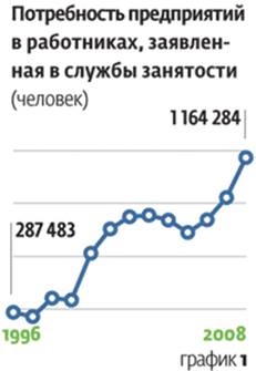 По графику видно, что потребность предприятий в работниках, заявленная в службе занятости с 1996 года очень сильно возросла. И причем, этот рост все время, только возрастал, но в 2004 начала падать, но потом опять возросла. И к 2008 году она стала 1162 284 человек.