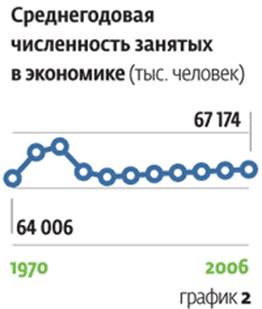 По графику 2 мы можем заметить, что среднегодовая численность занятых в экономике людей с 1970 года (64 006) по 2006 (67 174) увеличилась. Повышать зарплату вынуждают условия на рынке труда, потребности которого в рабочей силе возрастают с каждым годом. Ведь если наемный работник не может добиться повышения зарплаты у своего работодателя, он легко находит другого, готового платить больше.